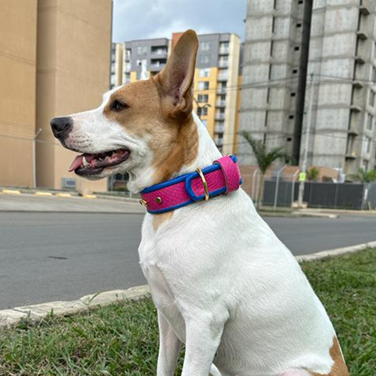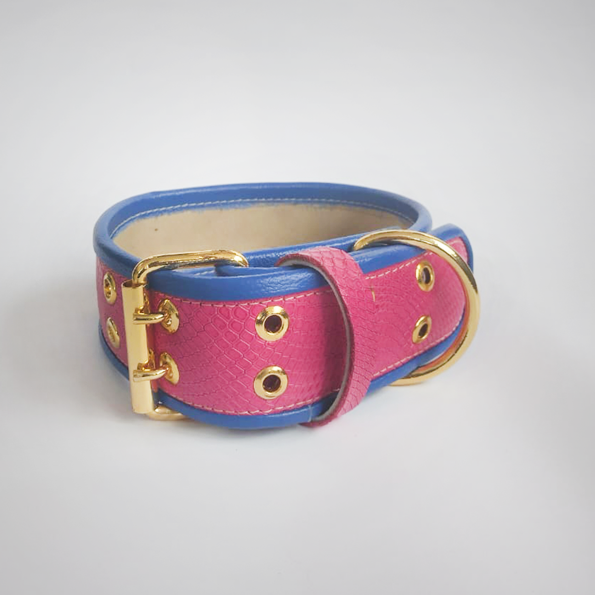 COLLAR HECHO DE 100% CUERO AUTENTICO (MEDIANO-GRANDE) COLOR ROSA BRILLANTE, CON PUNTO DE ENGANCHE, HERRAJES, PINESY PLACA PERSONALIZADA CON SU RESPECTIVO BAÑO DE ORO 24K, IDEAL PARA PERROS MEDIANOS Y GRANDES